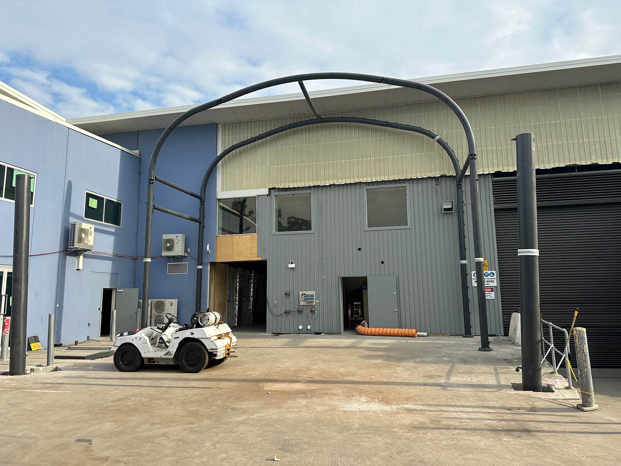 Engineered steel structure with tensioned waterproof PVC canopy