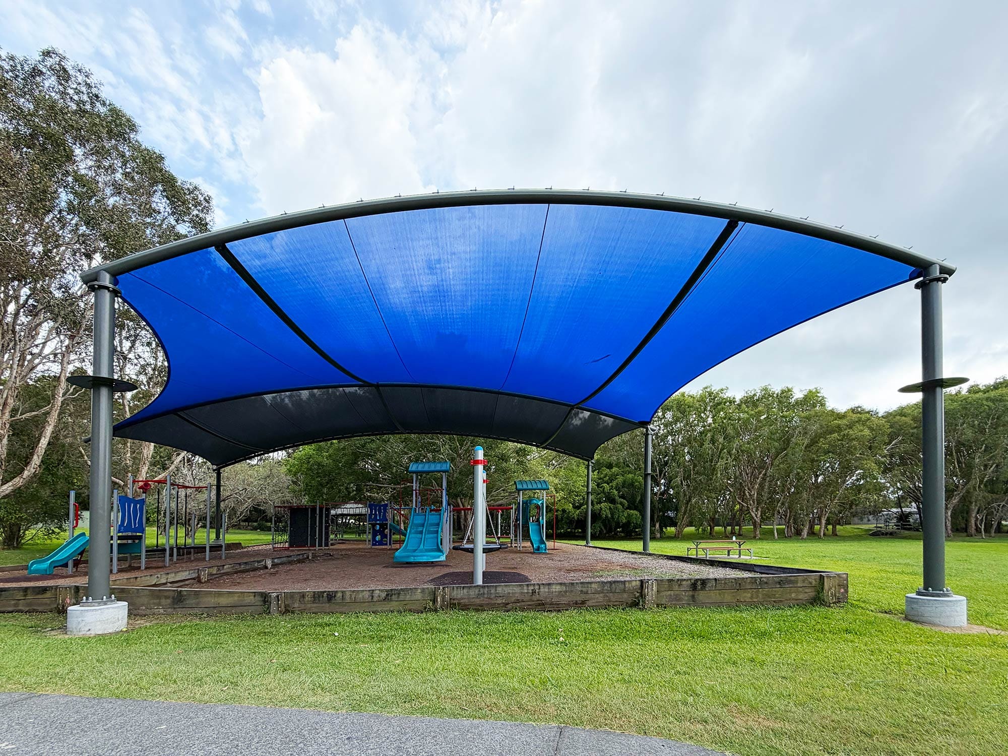 Engineered steel structure with tensioned shade sail canopy